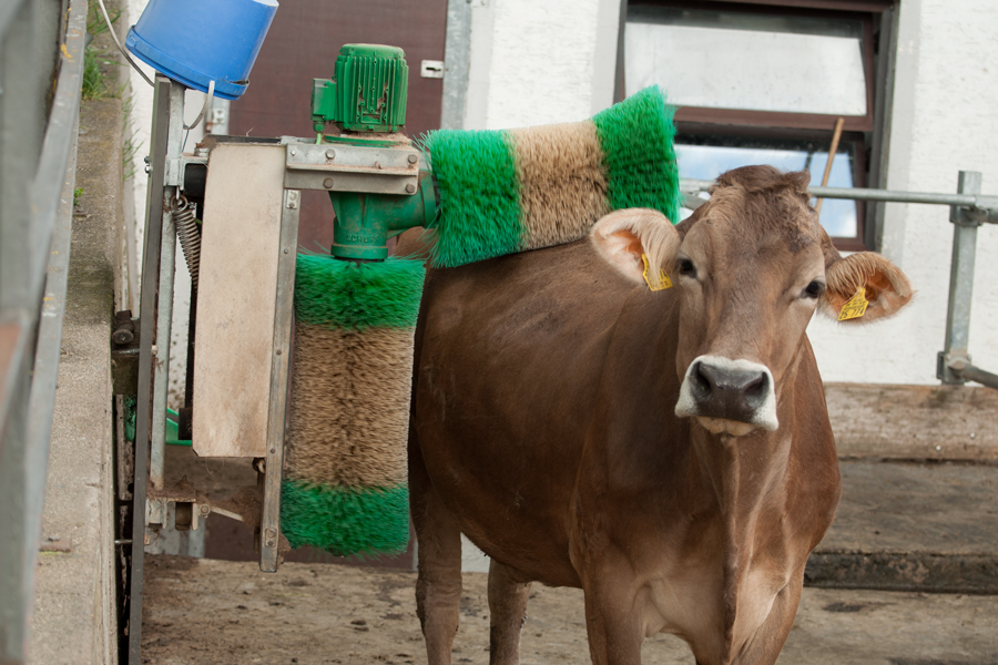 ein Wellnessangebot für Kühe zum sich wohlfühlen, Massage und das Fell säubern. Die Kuh fühlt sich wohl wie man sieht.